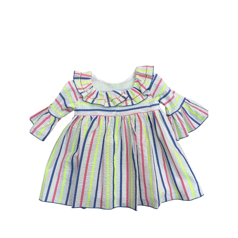 vestido niña vuelo manga francesq RAYAS fondo hielo raya fluor-rosa y azulón LAPEPPA moda infantil verano 26