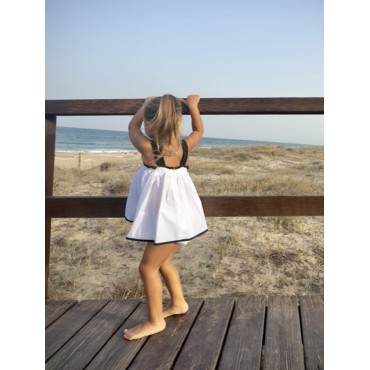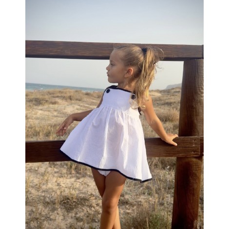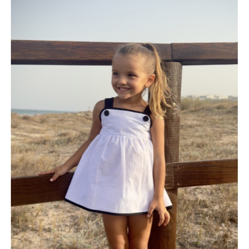 Jesusito-vestido  niña blanco con filo negro en blajo,tirantes con botones negros  NINI moda infantil verano 26